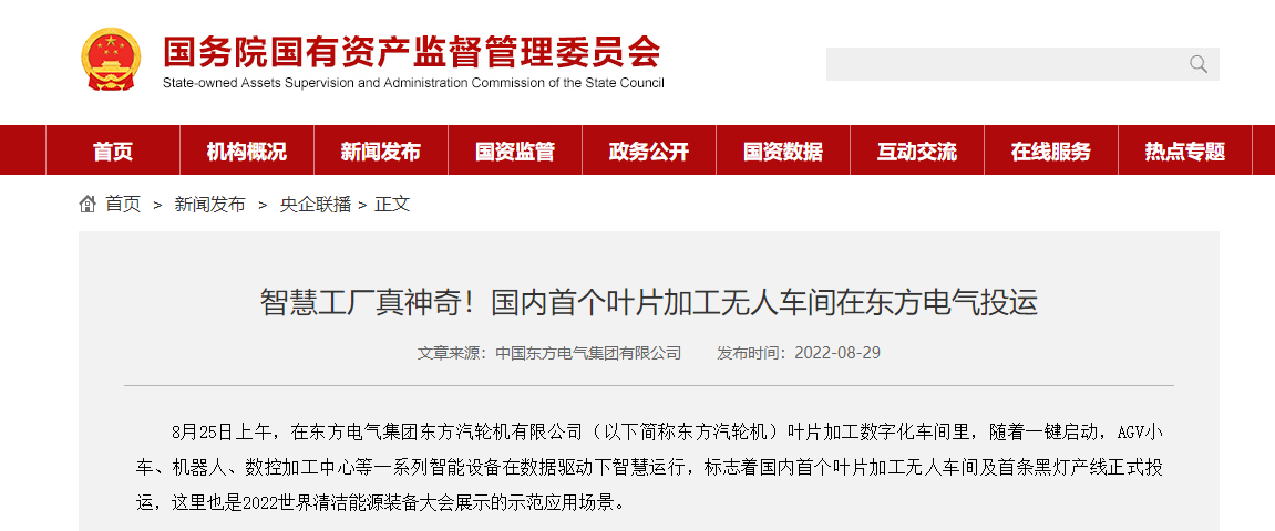 8月25日上午,在東方電氣集團(tuán)東方汽輪機(jī)有限公司(以下簡稱東方汽輪機(jī))葉片加工數(shù)字化車間里,隨著一鍵啟動,AGV小車、機(jī)器人、數(shù)控加工中心等一系列智能設(shè)備在數(shù)據(jù)驅(qū)動下智慧運(yùn)行,標(biāo)志著國內(nèi)首個葉片加工無人車間及首條黑燈產(chǎn)線正式投運(yùn),這里也是2022世界清潔能源裝備大會展示的示范應(yīng)用場景。