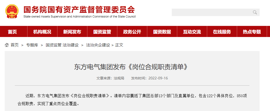 近期,東方電氣集團發(fā)布《崗位合規(guī)職責清單》。清單內(nèi)容囊括了集團總部13個部門及直屬單位,包含122個具體崗位,850項合規(guī)職責,實現(xiàn)了重點崗位全覆蓋。