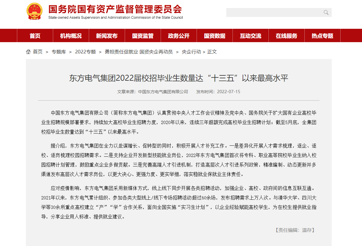 中國東方電氣集團有限公司(簡稱東方電氣集團)認(rèn)真貫徹中央人才工作會議精神及黨中央、國務(wù)院關(guān)于擴大國有企業(yè)高校畢業(yè)生招聘規(guī)模部署要求,持續(xù)加大高校畢業(yè)生招聘力度,2020年以來,連續(xù)三年超額完成高校畢業(yè)生招聘計劃;截至5月底,全集團校招畢業(yè)生數(shù)量達(dá)到“十三五”以來最高水平。