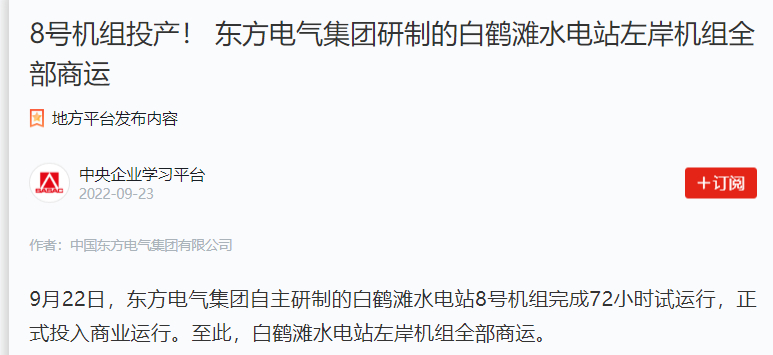 9月22日,東方電氣集團(tuán)自主研制的白鶴灘水電站8號(hào)機(jī)組完成72小時(shí)試運(yùn)行,正式投入商業(yè)運(yùn)行。至此,白鶴灘水電站左岸機(jī)組全部商運(yùn)。