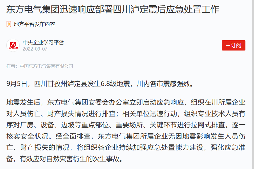 地震發(fā)生后,東方電氣集團安委會辦公室立即啟動應(yīng)急響應(yīng),組織在川所屬企業(yè)對人員傷亡、財產(chǎn)損失情況進(jìn)行排查;相關(guān)單位迅速行動,組織專業(yè)技術(shù)人員有序?qū)S房、設(shè)備、邊坡等重點部位、重要場所、關(guān)鍵環(huán)節(jié)進(jìn)行拉網(wǎng)式排查,逐一核實安全狀況。經(jīng)全面排查,東方電氣集團所屬企業(yè)無因地震影響發(fā)生人員傷亡、財產(chǎn)損失的情況,將組織各企業(yè)持續(xù)加強應(yīng)急處置能力建設(shè),強化應(yīng)急準(zhǔn)備,有效應(yīng)對自然災(zāi)害衍生的次生事故。