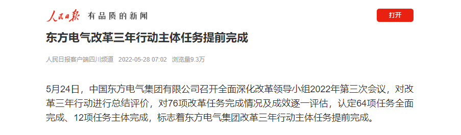 5月24日,中國東方電氣集團(tuán)有限公司召開全面深化改革領(lǐng)導(dǎo)小組2022年第三次會議,對改革三年行動進(jìn)行總結(jié)評價,對76項(xiàng)改革任務(wù)完成情況及成效逐一評估,認(rèn)定64項(xiàng)任務(wù)全面完成、12項(xiàng)任務(wù)主體完成,標(biāo)志著東方電氣集團(tuán)改革三年行動主體任務(wù)提前完成。