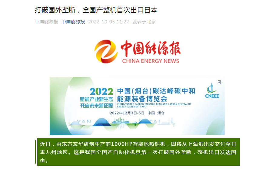 本次驗(yàn)收的日本1000HP智能地?zé)徙@機(jī)搭載東方宏華自主研發(fā)的全套自動(dòng)化機(jī)具,這是我國全國產(chǎn)自動(dòng)化機(jī)具第一次打破國外壟斷、整機(jī)出口發(fā)達(dá)國家,標(biāo)志著我國鉆機(jī)自動(dòng)化控制水平得到國際高端市場認(rèn)可。