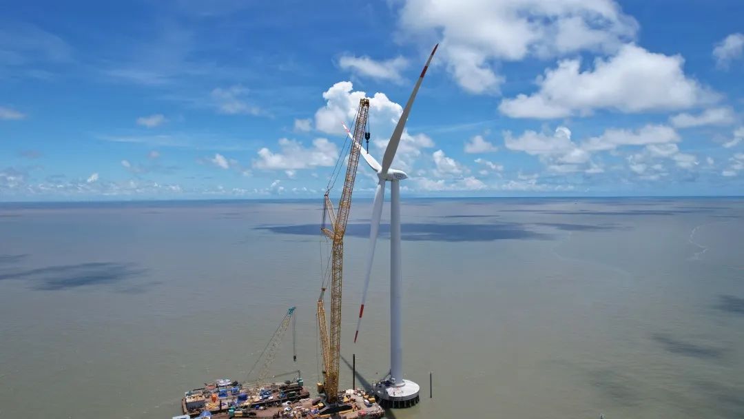 在一望無(wú)垠的越南檳椥省海域,為避免東北季風(fēng)干擾,中越建設(shè)者們正緊抓窗口期,進(jìn)行風(fēng)機(jī)吊裝。隨著最后一臺(tái)直徑155米、重量105噸的風(fēng)輪與發(fā)電機(jī)嚴(yán)密對(duì)接,越南長(zhǎng)海4期海上風(fēng)電項(xiàng)目7臺(tái)機(jī)組全部吊裝完畢。
