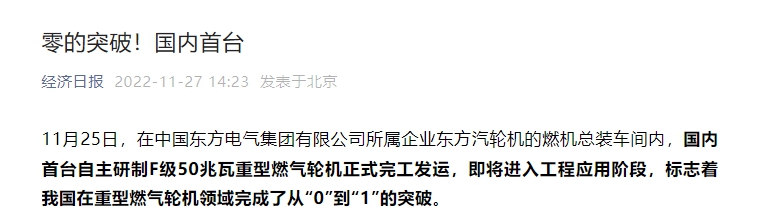 11月25日,在中國東方電氣集團(tuán)有限公司所屬企業(yè)東方汽輪機(jī)的燃機(jī)總裝車間內(nèi),國內(nèi)首臺自主研制F級50兆瓦重型燃?xì)廨啓C(jī)正式完工發(fā)運(yùn),即將進(jìn)入工程應(yīng)用階段,標(biāo)志著我國在重型燃?xì)廨啓C(jī)領(lǐng)域完成了從“0”到“1”的突破。