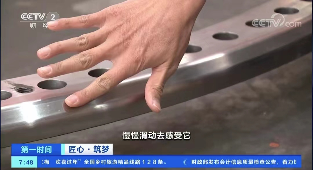 “其實(shí)我們鉗工的手本身應(yīng)該有很多老繭,手這個(gè)地方一定要(保持好)柔嫩。基本上在0.01毫米到0.02毫米這種壞的(地方)我們都能感覺出來。可能有10年以上的工作經(jīng)驗(yàn),才能逐步去感受到。”