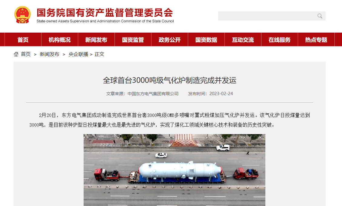 2月20日,東方電氣集團(tuán)成功制造完成世界首臺套3000噸級OMB多噴嘴對置式粉煤加壓氣化爐并發(fā)運(yùn)。該氣化爐日投煤量達(dá)到3000噸,是目前該種爐型日投煤量最大也是最先進(jìn)的氣化爐,實(shí)現(xiàn)了煤化工領(lǐng)域關(guān)鍵核心技術(shù)和裝備的歷史性突破。