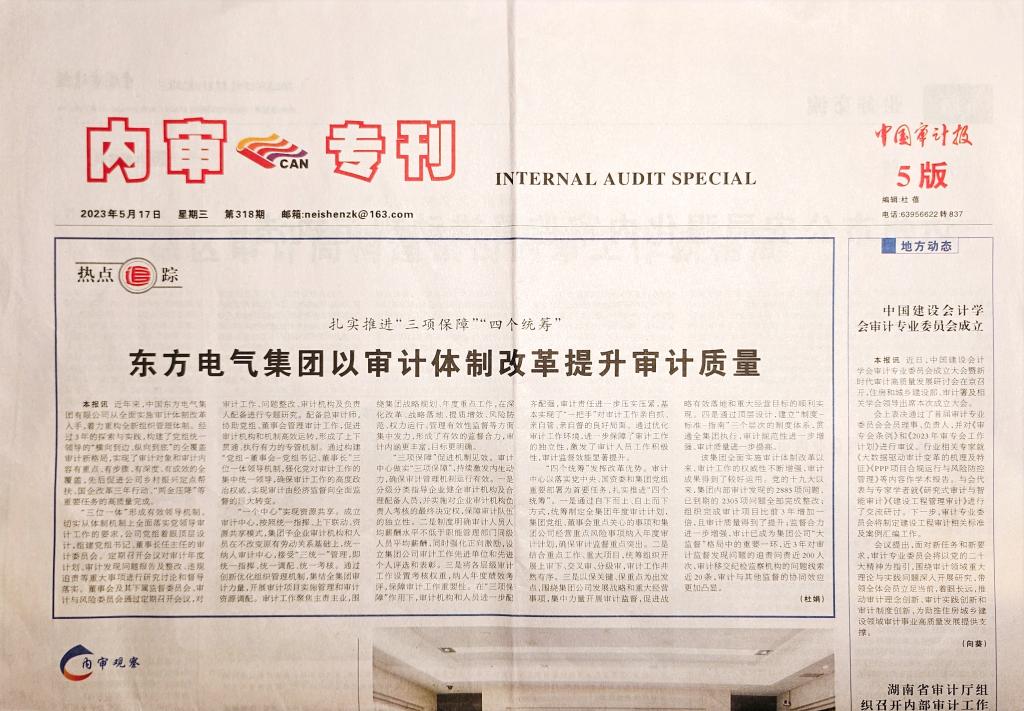 本報訊 近年來,中國東方電氣集團有限公司從全面實施審計體制改革入手,著力重構(gòu)全新組織管理體制。經(jīng)過3年的探索與實踐,構(gòu)建了黨組統(tǒng)一領(lǐng)導的“橫向到邊、縱向到底”的全覆蓋審計新格局,實現(xiàn)了審計對象和審計內(nèi)容有重點、有步驟、有深度、有成效的全覆蓋,先后促進公司鄉(xiāng)村振興定點幫扶、國企改革三年行動、“兩金壓降”等重要任務的高質(zhì)量完成。