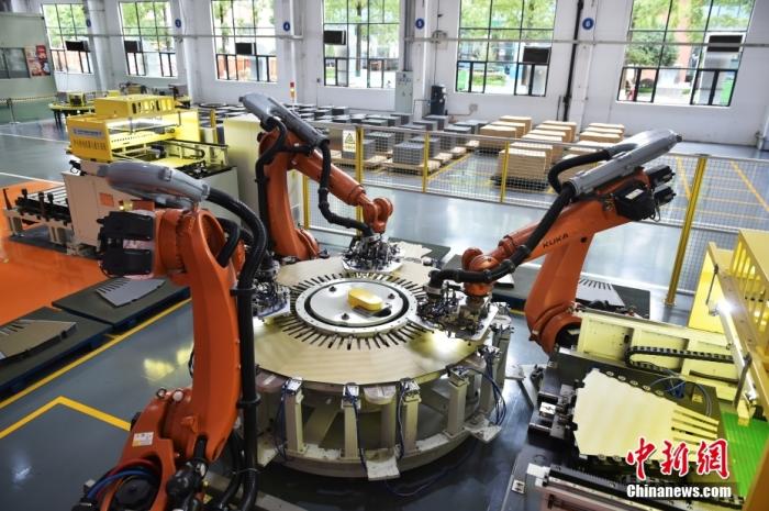 “無(wú)人車(chē)間”里的機(jī)器人在進(jìn)行疊片作業(yè)。中新網(wǎng)記者 李駿 攝