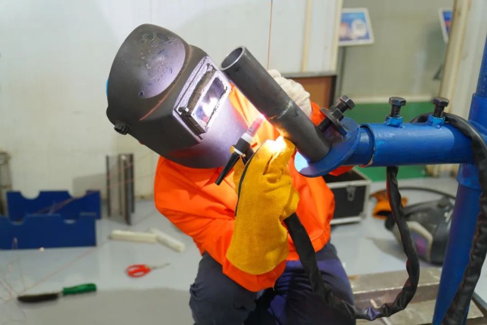 電焊工選手正在進(jìn)行焊接作業(yè),該賽項內(nèi)容包含了整個裝備制造焊接作業(yè)中手工焊接、焊條電弧焊接、鎢極氬弧焊接、氣體保護焊多種焊接方法和焊接位置。