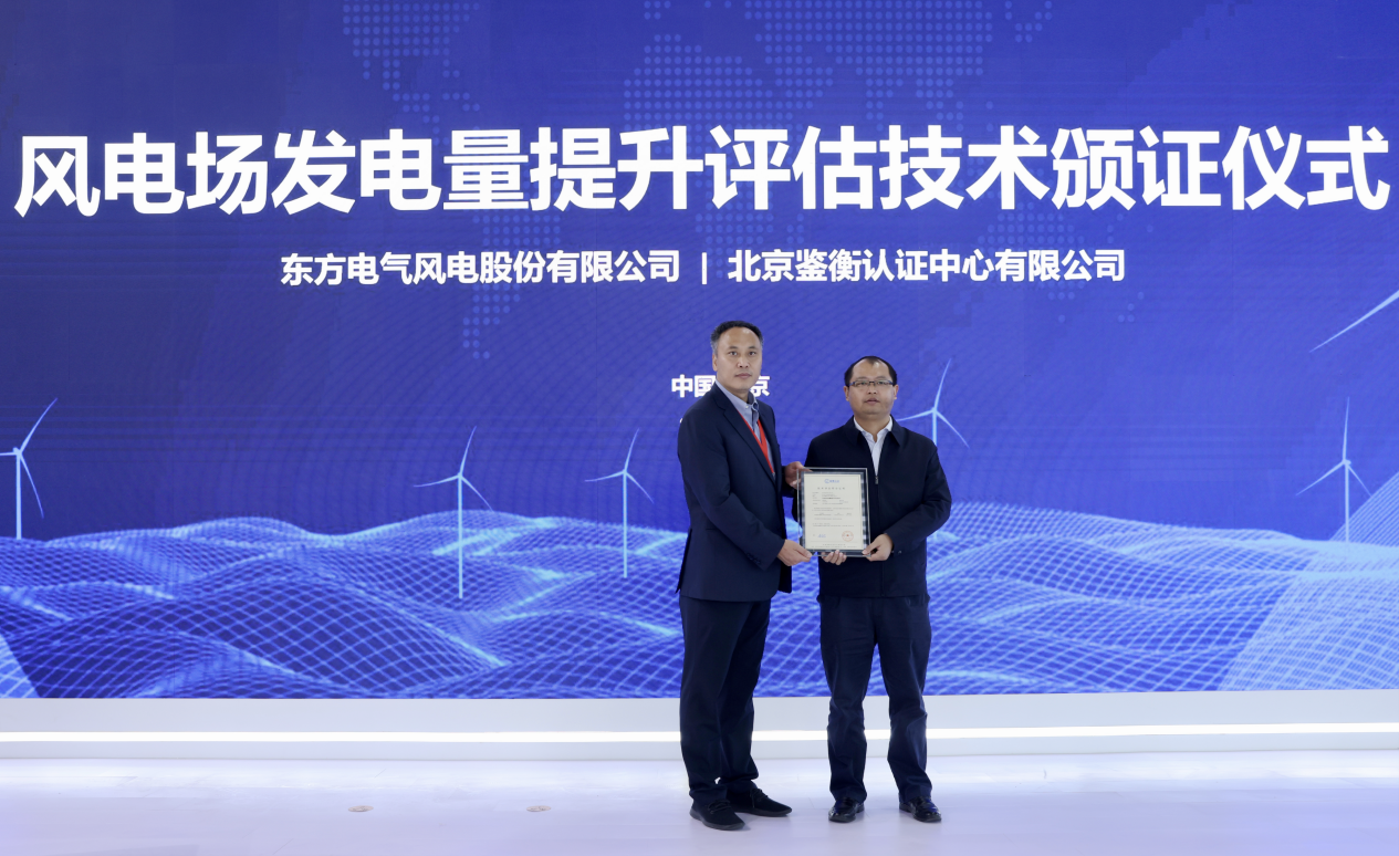 展會(huì)期間,北京鑒衡認(rèn)證中心向東方風(fēng)電頒發(fā)《風(fēng)電場(chǎng)發(fā)電量提升評(píng)估技術(shù)》認(rèn)證證書。