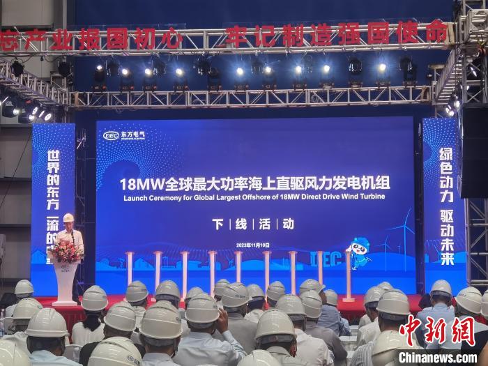 11月10日,18兆瓦直驅(qū)海上風(fēng)電機(jī)組在福建福州福清市東方電氣風(fēng)電(福建)有限公司生產(chǎn)基地下線。中新網(wǎng)記者龍敏攝