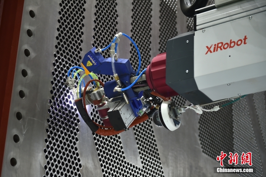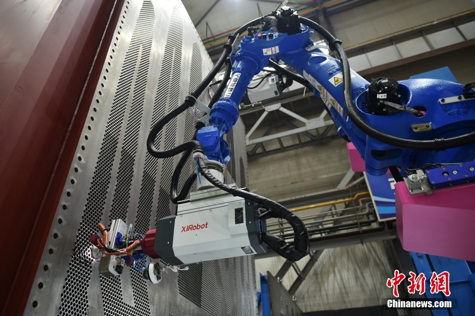 圖為車間里的焊接機(jī)器人正在進(jìn)行“鐵臂繡花”。