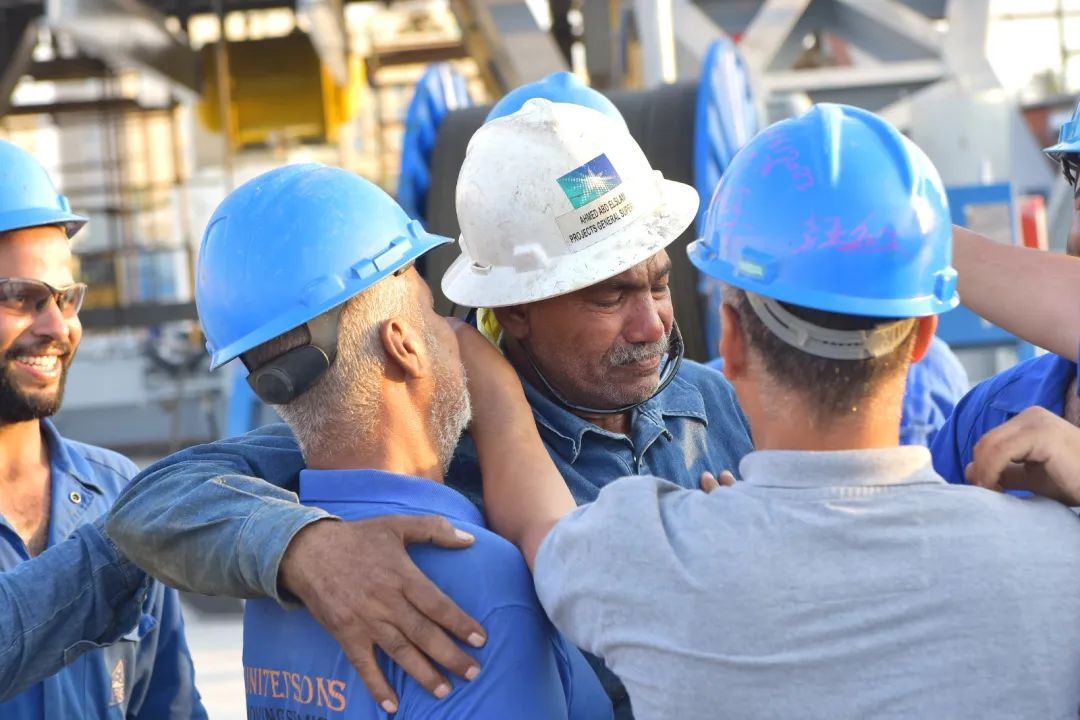 在首套鉆機成功下線時,激動不已的埃及雇員們,在這套鉆機下互相擁抱、合影?;ハ嗤信e慶祝的他們,臉上有笑容,也有淚光。