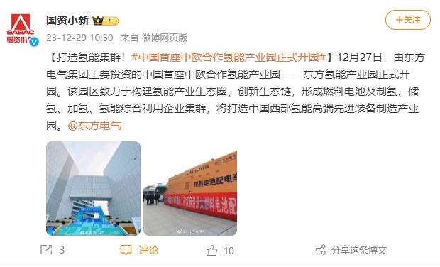 【打造氫能集群!#中國首座中歐合作氫能產(chǎn)業(yè)園正式開園#】12月27日,由東方電氣集團(tuán)主要投資的中國首座中歐合作氫能產(chǎn)業(yè)園——東方氫能產(chǎn)業(yè)園正式開園。該園區(qū)致力于構(gòu)建氫能產(chǎn)業(yè)生態(tài)圈、創(chuàng)新生態(tài)鏈,形成燃料電池及制氫、儲氫、加氫、氫能綜合利用企業(yè)集群,將打造中國西部氫能高端先進(jìn)裝備制造產(chǎn)業(yè)園。@東方電氣