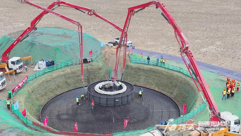 5月24日,在木壘哈薩克自治縣東南部的大石頭風(fēng)場,隨著混凝土泵車的轟鳴,東方電氣木壘100萬千瓦風(fēng)電項(xiàng)目風(fēng)電機(jī)組塔基混凝土澆筑工作正加緊施工,為推進(jìn)項(xiàng)目年底建成投產(chǎn)邁進(jìn)了堅(jiān)實(shí)一步。
