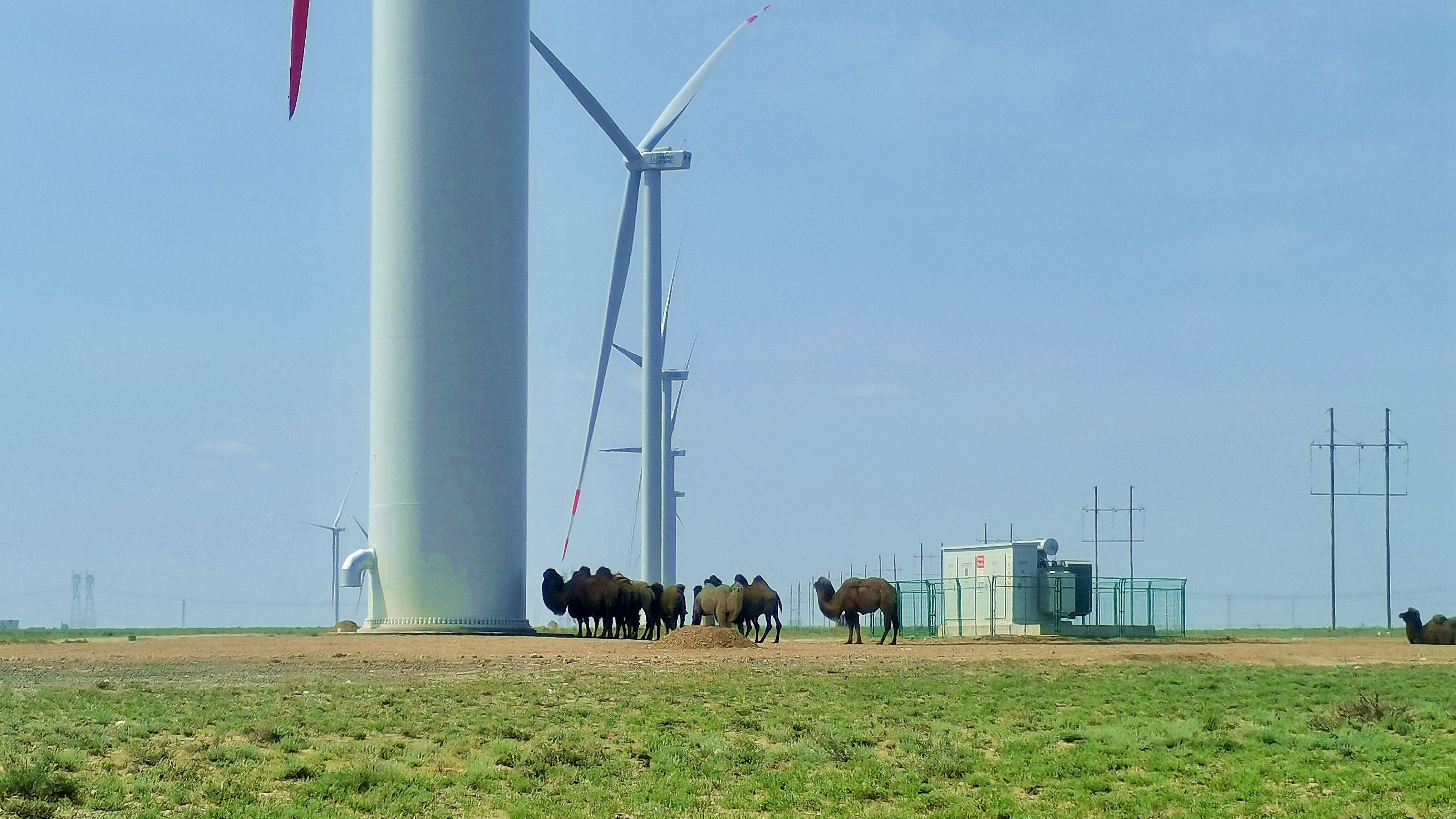 在大美新疆,東方風(fēng)電為克拉瑪依源網(wǎng)荷儲一體化250兆瓦風(fēng)電項目提供46臺風(fēng)電機組。成群的駱駝在東方風(fēng)機下安心休憩。