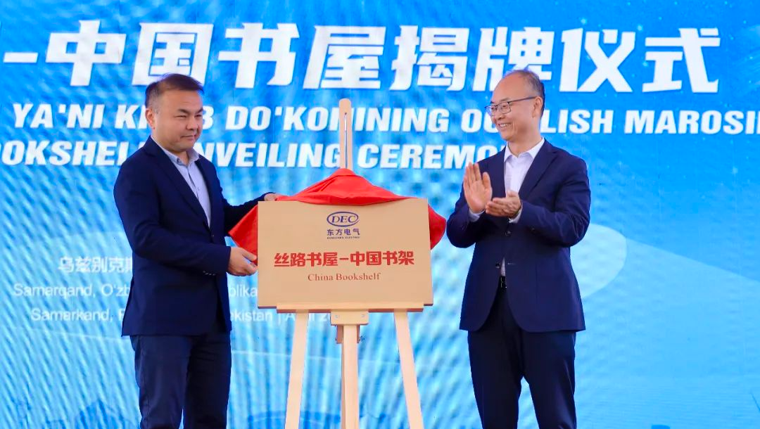 活動(dòng)中,烏米德·馬馬達(dá)米諾夫和袁明剛共同為東方電氣“絲路書屋——中國(guó)書架”揭牌。此次,東方電氣共捐贈(zèng)150余冊(cè)圖書內(nèi)容涵蓋中國(guó)經(jīng)濟(jì)社會(huì)發(fā)展、歷史文化、文學(xué)藝術(shù)、科技發(fā)展等方面,為當(dāng)?shù)貑T工深入了解中國(guó)搭建窗口,進(jìn)一步構(gòu)筑兩國(guó)文化交流之橋。