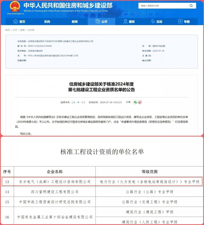 近日,中華人民共和國住房和城鄉(xiāng)建設部公布了2024年度第七批建設工程企業(yè)資質(zhì)名單,東方電氣集團國際合作有限公司下屬企業(yè)東方設計成功獲取電力行業(yè)(火力發(fā)電(含核電站常規(guī)島設計))專業(yè)甲級工程設計資質(zhì),這是電力行業(yè)含金量最高的專業(yè)甲級工程設計資質(zhì)之一,也是國家住建部近三年唯一批準的電力行業(yè)火電專業(yè)甲級工程設計資質(zhì),標志著東方電氣集團正式擁有電力工程甲級設計院可承接各類煤電、氣電、核電(常規(guī)島)以及電站升級改造等工程的總設計和總承包業(yè)務。