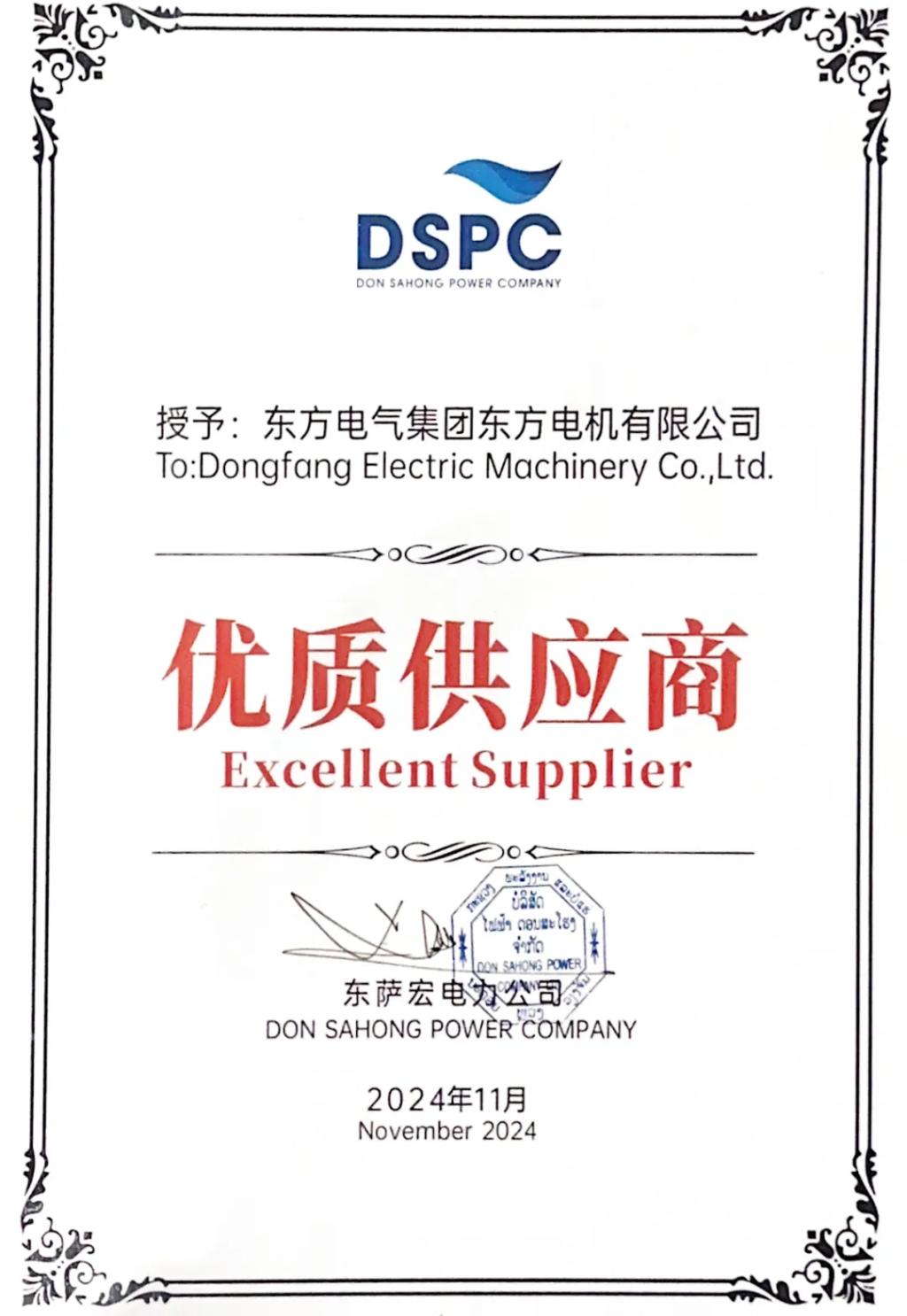 東薩宏電力公司向東方電機(jī)頒發(fā)的“優(yōu)質(zhì)供應(yīng)商”證書,是對機(jī)組運(yùn)行優(yōu)異的最好證明。