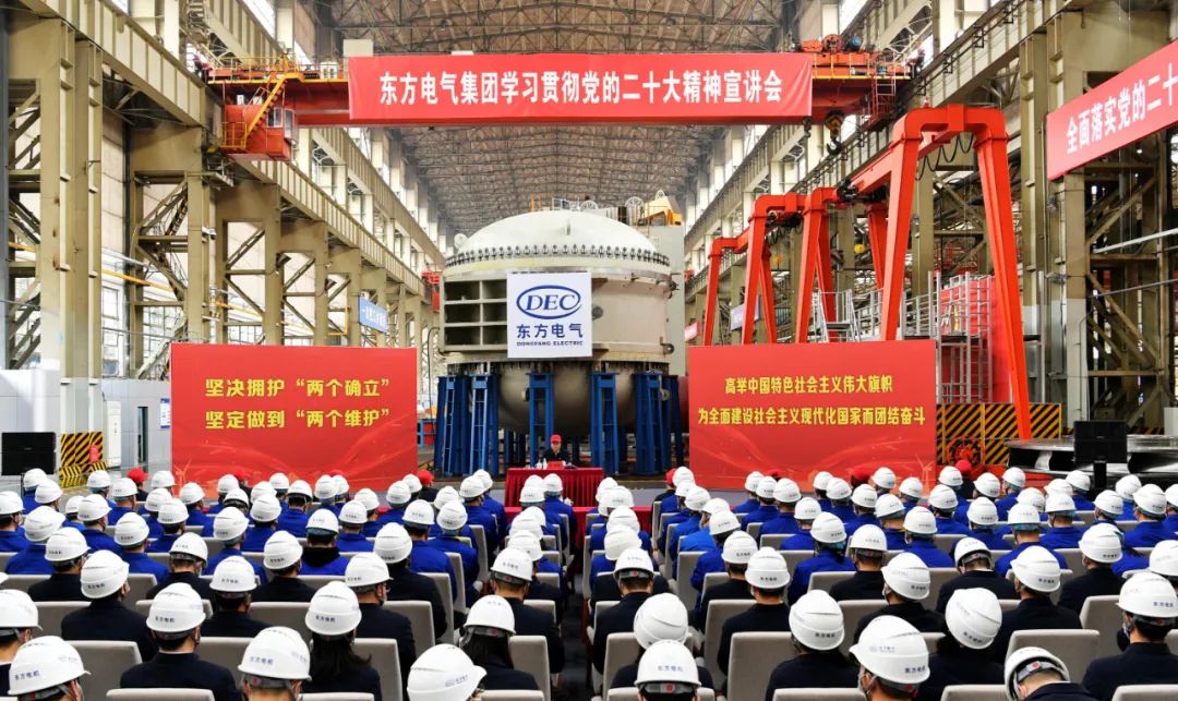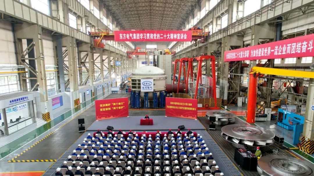 本網(wǎng)訊 11月10日,四川德陽天朗氣清,東方電氣集團所屬東方電機的大型清潔能源裝備重型制造數(shù)字化車間巨型部件錯落有致,坦桑尼亞朱利諾水電項目巨型蝶閥展現(xiàn)“重器”力量,這是東方電氣集團學習貫徹黨的二十大精神首場宣講會現(xiàn)場。當天,黨的二十大代表,東方電氣集團黨組書記、董事長俞培根在車間一線宣講黨的二十大精神。