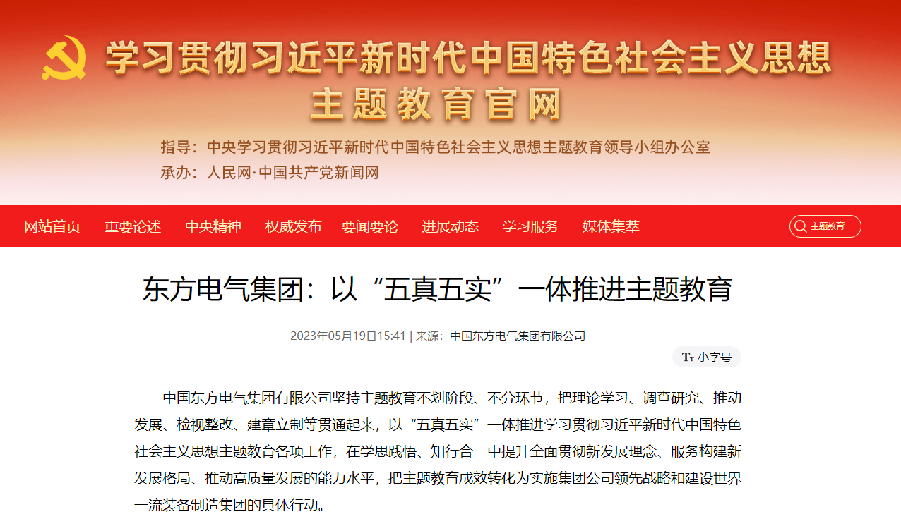 中國東方電氣集團(tuán)有限公司堅(jiān)持主題教育不劃階段、不分環(huán)節(jié),把理論學(xué)習(xí)、調(diào)查研究、推動發(fā)展、檢視整改、建章立制等貫通起來,以“五真五實(shí)”一體推進(jìn)學(xué)習(xí)貫徹習(xí)近平新時(shí)代中國特色社會主義思想主題教育各項(xiàng)工作,在學(xué)思踐悟、知行合一中提升全面貫徹新發(fā)展理念、服務(wù)構(gòu)建新發(fā)展格局、推動高質(zhì)量發(fā)展的能力水平,把主題教育成效轉(zhuǎn)化為實(shí)施集團(tuán)公司領(lǐng)先戰(zhàn)略和建設(shè)世界一流裝備制造集團(tuán)的具體行動。