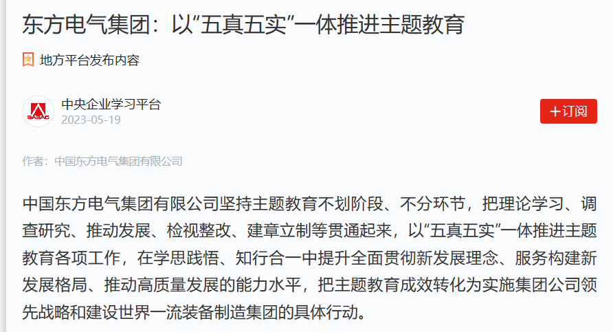 中國東方電氣集團(tuán)有限公司堅(jiān)持主題教育不劃階段、不分環(huán)節(jié),把理論學(xué)習(xí)、調(diào)查研究、推動(dòng)發(fā)展、檢視整改、建章立制等貫通起來,以“五真五實(shí)”一體推進(jìn)主題教育各項(xiàng)工作,在學(xué)思踐悟、知行合一中提升全面貫徹新發(fā)展理念、服務(wù)構(gòu)建新發(fā)展格局、推動(dòng)高質(zhì)量發(fā)展的能力水平,把主題教育成效轉(zhuǎn)化為實(shí)施集團(tuán)公司領(lǐng)先戰(zhàn)略和建設(shè)世界一流裝備制造集團(tuán)的具體行動(dòng)。