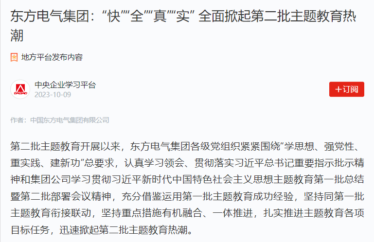 第二批主題教育開展以來,東方電氣集團(tuán)各級黨組織緊緊圍繞“學(xué)思想、強(qiáng)黨性、重實(shí)踐、建新功”總要求,認(rèn)真學(xué)習(xí)領(lǐng)會(huì)、貫徹落實(shí)習(xí)近平總書記重要指示批示精神和集團(tuán)公司學(xué)習(xí)貫徹習(xí)近平新時(shí)代中國特色社會(huì)主義思想主題教育第一批總結(jié)暨第二批部署會(huì)議精神,充分借鑒運(yùn)用第一批主題教育成功經(jīng)驗(yàn),堅(jiān)持同第一批主題教育銜接聯(lián)動(dòng),堅(jiān)持重點(diǎn)措施有機(jī)融合、一體推進(jìn),扎實(shí)推進(jìn)主題教育各項(xiàng)目標(biāo)任務(wù),迅速掀起第二批主題教育熱潮。